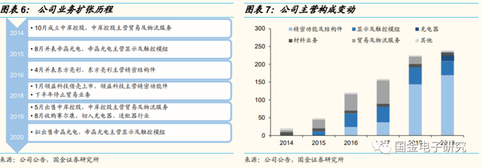 ◾ 壳公司江粉磁材是一家磁性材料制造企业,2014年10月成立中岸控股切入贸易及物流服务行业;2015年8月并表帝晶光电、切入显示及触控模组行业;2016年4月并表东方亮彩,切入精密结构件行业。2017年江粉磁材构成“精密结构件、显示及触控模组、材料、贸易”四大业务。