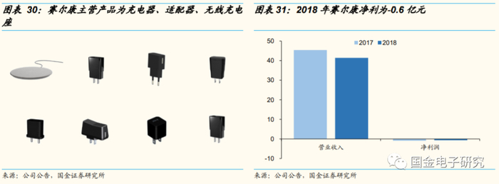◾ 赛尔康是充电器龙头,充电器年产能达5.2亿只,总部位于芬兰。公司主营产品包括充电器、适配器、无线充电座。2018年赛尔康营收为41亿元,营业收入远超同业,但盈利能力(毛利率、净利率)远低于同业。考虑领益智造制造能力、管理能力远超同业,我们认为收购完成后、赛尔康盈利能力有望大幅提升、扭亏为盈。