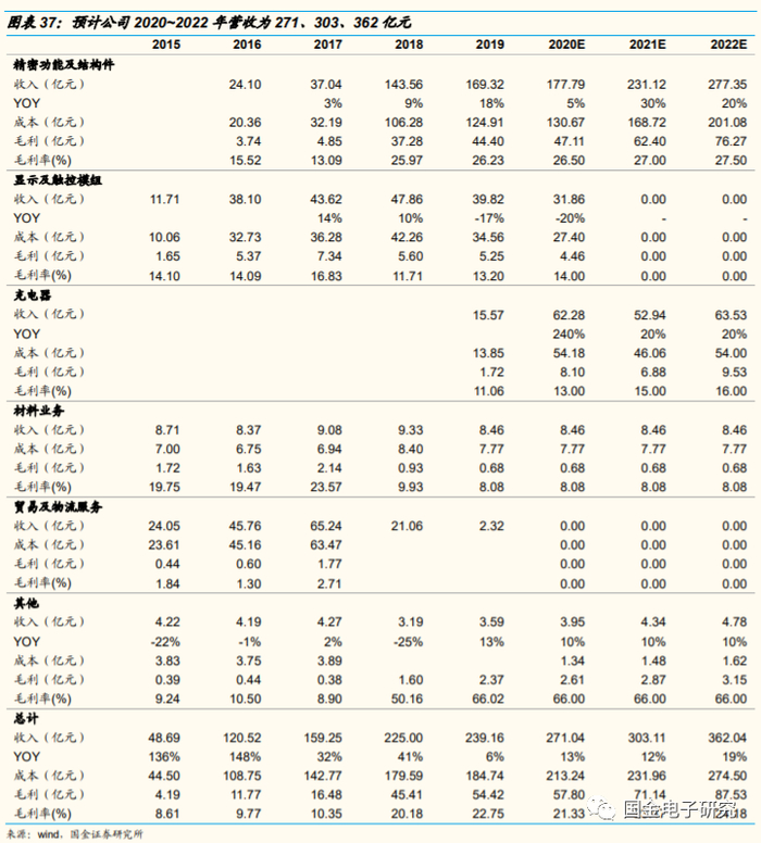◾ 预计公司2020~2022年营收为271、303、362亿元。1)考虑精密功能及结构件业务受益单机价值量提升、A客户产业链回暖,预计2020~2022精密功能及结构件行业应用收入同增5%、30%、20%,伴随单机价值量提升、毛利率提升至26.5%、27%、27.5%。2)考虑公司已出售贸易资产、拟出售显示触控模组资产,假设公司于2020年末出售显示触控模组资产,预计2021、2022年公司相关业务营收为0。3)考虑目前公司充电器业务毛利率低于同业,预计伴随整合完成,充电器业务毛利率持续提升至行业均值水平。考虑2019年9月并表充电器业务,预计2020~2022年充电器业务同增240%、20%、20%,毛利率达13%、15%、16%。