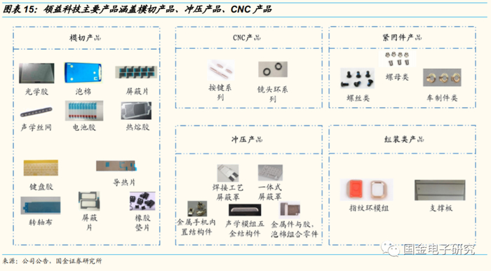 ◾ 从产品来看,精密功能件产品主要包括紧固件、密封、导热、缓冲、绝缘、屏蔽、标签、按键等。领益科技主营业务为模切产品(包括光学胶、泡棉、屏蔽片、声学丝网、电池胶、热熔胶、导热片等)、冲压产品(包括屏蔽罩、金属内置结构件等)、CNC产品(包括按键产品、摄像头环装饰件等)、紧固件产品、组装类产品。2016模切产品、冲压产品、CNC产品营收占比分别为48%、23%、22%。