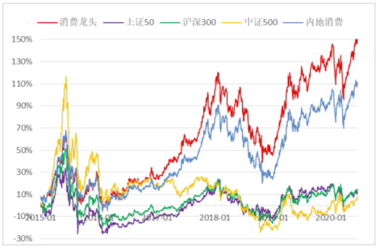 缩短时间来看,消费龙头指数近5年走势也是显著强于内地消费指数和A股各主流宽基指数!自2015年1月5日以来截至2020年6月18日,消费龙头指数累计收益率高达150.81%,而同期内地消费指数收益率为111.33%,沪深300收益率为14.45%,上证50收益率为11.91%,中证500收益率为7.73%。