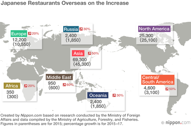 其中,就地域来细分,亚洲(除日本外)地区的增幅最为显著,较2015年的统计增加了53%,约为69300家。亚洲地区也集中了日本海外近60%的日料店。