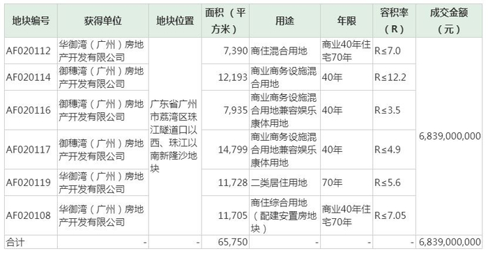 6月19日,华夏幸福公告,华夏幸福(深圳)运营管理有限公司旗下下属公司华御湾(广州)房地产开发有限公司、御穗湾(广州)房地产开发有限公司以68.39亿元底价拿下广州荔湾区白鹅潭沿江总部经济带新隆沙项目的6幅地块,合计面积65750平方米,计容总建筑面积44.8984万平方米。该项目折合楼面价约18662元/平方米(扣除配建82513平方米安置房面积)。