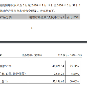 6月18日盘后,宝莱特发布公告回复深交所关注函,其披露截至5月底境外经销商新增订单金额5.22亿元中,有4.96亿元来自于监护产品,占比95.14%;2534.27万元来自于手套、口罩、防护服等贸易产品,占比4.86%。