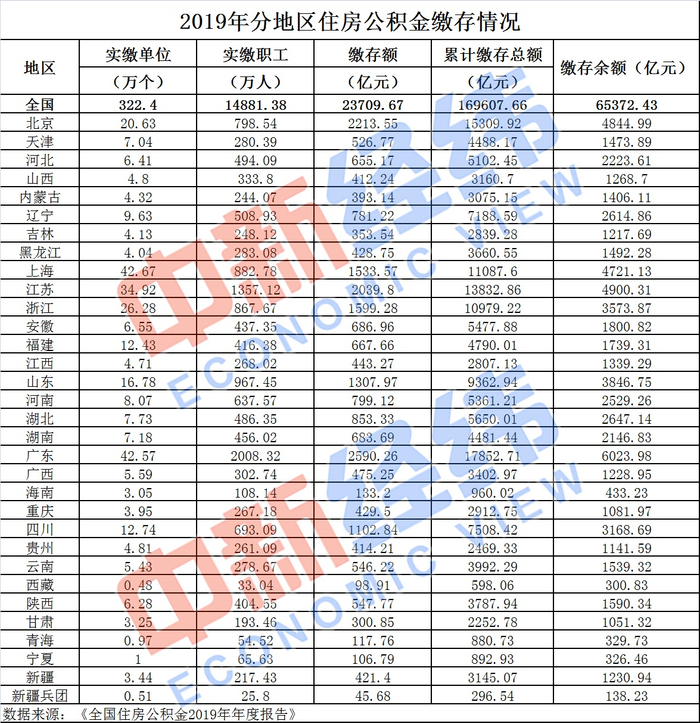 从截至2019年末的累计缴存总额看,广东(17852.71亿元)、北京(15309.92亿元)、江苏(13832.86亿元)、上海(11087.60亿元)、浙江(10979.22亿元)等5省份超万亿。