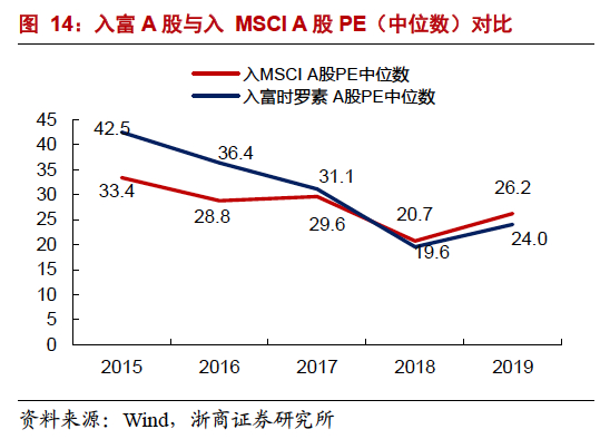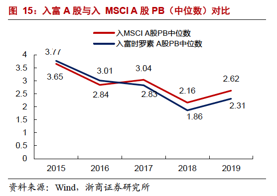 入富A股PE和PB与入MSCI A股相差不大。从市盈率来看,2015年入富A股PE中位数为42.5,略低于入MSCI A股PE中位数,2019年入富A股PE中位数为24.0,入MSCI A股PE中位数为26.2,入富A股估值略有回调,趋近于入MSCI A股估值。从市净率来看,2015-2016年,入富A股PB中位数高于入MSCI A股,2017-2019年,入富A股PB中位数略低于入MSCI A股,二者相差约2个百分点。