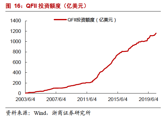 根据富时罗素官方数据测算,第一阶段第四步纳入完成后预计可带来约210亿人民币被动增量资金。我们认为今年外资主动流入的规模有望达到3000-4000亿人民币。同时,随着QFII投资额度的放开,国家政策的扶持将引导更多外资入场,未来几年中国资本市场对外开放的步伐将大幅加快,外资长期流入趋势不改。