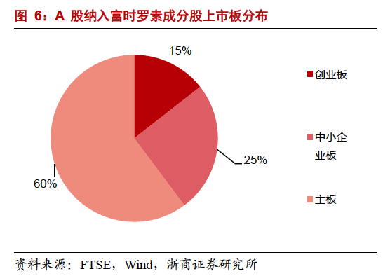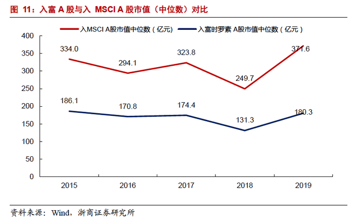 入富A股市值中位数低入MSCI A股,富时罗素更多关注中小盘股票。从市值来看,2015-2019年,入富A股市值中位数一直低于入MSCI A股。2019年,入富A股市值中位数为180.3亿元,入MSCI A股市值中位数为371.6亿元。整体上,入富A股市值低于入MSCI A股市值,富时罗素更多覆盖中小盘股票。