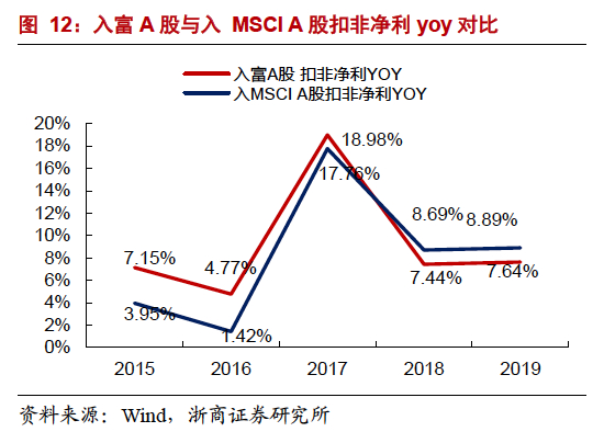 入富A股扣非净利增长率及ROE表现均逊色于入MSCI A股。从公司基本面来看,2015-2017年入富A股扣非净利增速高于入MSCI A股增速,其后2018-2019年,入富A股扣非净利增速表现一般。2015-2019年,入MSCI A股平均ROE表现优于入富A股,且二者之间存在一定的差距。