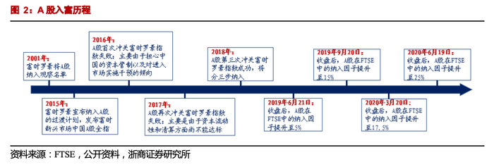 四年三次冲关,A股成功入富。2001年富时罗素将 A 股纳入了观察名单,2015 年便开始讨论是否将 A 股纳入国际指数。2016年富时罗素拒绝将中国 A 股纳入新兴市场指数,主要由于“担心中国的资本管制以及对金融市场实施干预的倾向”。2017年富时罗素对A股进行评估,但由于“资本流动性和清算交割制度方面尚不能达标”,A 股仍未能纳入。2018年,富时罗素评估了中国政府通过市场改革增进全球投资者准入的持续举措(如QFII和RQFII等),以及互联互通机制的提升,认为A 股市场现在已达到被纳入富时新兴市场指数的要求。6月富时罗素年度会议上决定将中国A股从“未分级”上调至“次级新兴市场”,分三批次(后调整为四批次)按各自可投资市值的25%纳入全球股票FTSE GEIS指数体系内。纳入因子基于预计的资金流入量、股票互联互通机制和离岸人民币(CNH)的容量推算得出。
