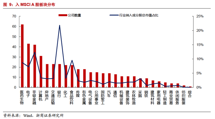 >> 入富A股中小创股票占比高于MSCI;行业分布上,医药生物、电子、计算机板块公司数量占比较高