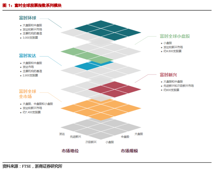 富时罗素指数体系完备,广泛覆盖全球股票。富时罗素是英国伦敦交易所下的全资公司,是全球第二大指数编制公司,旗下指数包括全球股票、货币、固收、房地产等类别,其中富时全球股票指数体系(FTSE GEIS)是富时罗素指数公司的旗舰指数体系。富时罗素全球股票指数体系可以按照市场和市值两个维度进行划分,从市场维度可细分为:发达市场、新兴市场(先进新兴和次级新兴)、前沿市场;从市值维度可以细分为:大盘、中盘、小盘和微盘。投资者可以按照市场类别和市值规模挑选指数,其中与中国相关的核心指数主要包括富时环球指数、富时新兴市场指数等。官网显示,富时罗素全球股票指数体系包含46个国家的7,400多支股票,占全球可投资市场总市值的98%,为投资者带来广泛的股票覆盖率。