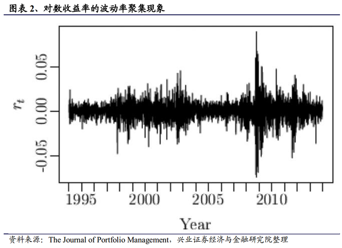 图表2展示了股票指数每日的对数收益率。正如Mandelbrot(Mandelbrot [1963])指出的那样,价格波动会形成聚集现象,因为大的价格波动往往会跟随着大的价格波动,反之亦然。RBAA策略的目的是利用波动的持续性,因为Kritzman和Li [2010]曾指出,一般而言动荡时期经过风险调整后的平均回报较低,且与动荡的原因无关。我们的目的不是找出最佳策略,而是讨论RBAA方法的盈利能力。