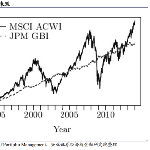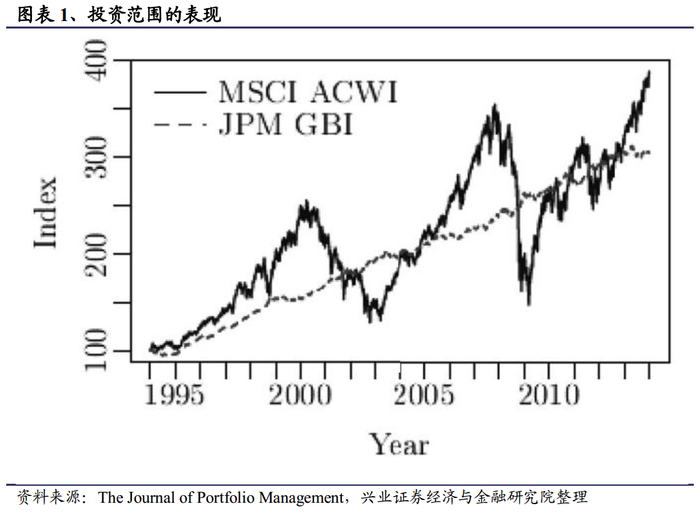 受状态转换策略具有显著盈利能力的启发,本文通过让数据说话的方式来挑战Dopfel [2010]的结论。在由全球股票指数(MSCI ACWI)和全球政府债券指数(JPM GBI)组成的投资范围中,我们将RBAA策略表现与基于静态权重再平衡的策略表现进行了比较,图表1展示了过去20年内两指数的情况。