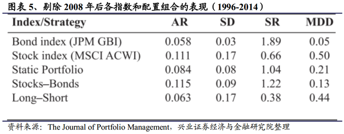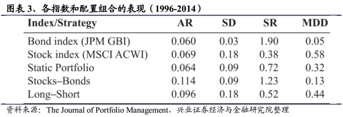 债券指数具有最高的夏普比率(SR)且年化收益率(AR)为6.0%,调整后的年化波动率(SD)仅3%,我们使用Kinlaw,Kritzman和Turkington [2015]提出的方法对文章的年化波动率进行了调整。样本区间内利率下行和低通胀的环境使得债券表现强劲,未来的环境可能不会如此利好债券。