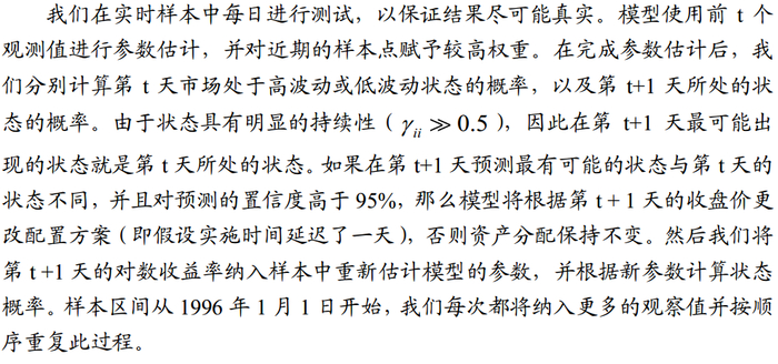 本文的结果表明:与静态策略相比,基于状态转换的资产配置策略(RBAA)不需要任何预测能力且能获得更好的表现。我们在样本中每日都进行测试,以保证结果尽可能真实,本文使用了具有时变参数的状态转换模型来确定市场收益的状态,虽然参数每天都会更新,但是在任意时间段使用的方法是相同的。我们认为本文结果是稳健的,因为模型没有关于均衡收益、波动率或相关性的假设,完全基于可利用的市场数据。此外,模型或许可以通过纳入经济指标、利率、投资者信心调查或其他指标来增强效果。