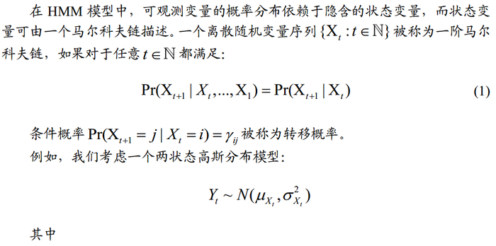 HMM能够探测到金融市场状态的突然转换,也能够捕捉到新状态转换后的长期持续性。这种模型非常适合于捕捉很多金融时间序列具有的波动率聚集和肥尾分布的特点(Ryden、Terasvirta和Asbrink,1998)。