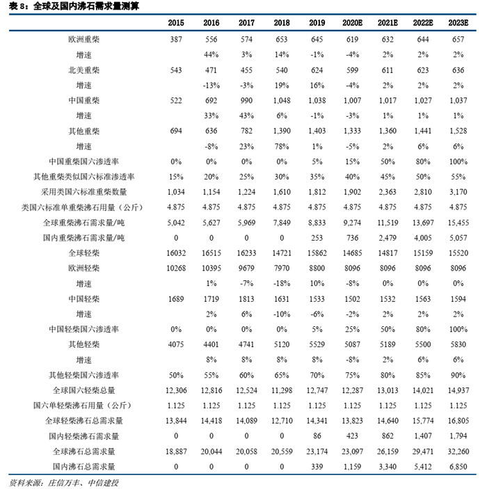 国六标准重柴沸石用量以每辆车4.875kg估算(重柴平均排量以13升计,SCR催化剂整体体积以排量2.5倍计,沸石用量以每升催化剂150g计);轻柴沸石用量以每辆车0.63kg估算(轻柴平均排量以3升计,SCR催化剂体积为排量的2.5倍,沸石用量150g/L)。综合计算得到,全球2019年沸石需求量约2.32万吨,至2023年将增长至3.23万吨,年均增速8.6%;而国内由于国六标准的陆续实施将直接产生约6850吨的纯增量。