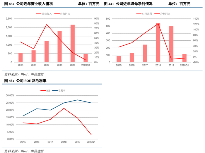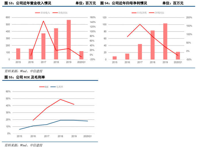 2019年公司实现营业收入21.53亿元,同比增长19.76%;归母净利5.01亿元,同比下滑7.82%;扣非后归母净利4.71亿元,同比增长20.77%。公司在2020年一季度实现营业收入4.87亿元,同比增长4.67%;归母净利1.15亿元,同比下滑3.98%;扣非后归母净利1.08亿元,同比下滑6.39%。公司毛利率呈逐年上升趋势,2019年达到26.90%。