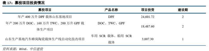 募投项目确保未来发展预期。未来公司将形成400万升DPF、200万升DOC、160万升TWC、200万升GPF生产能力。公司新产品通过了公司、外部检测单位的性能测试,其中 DPF 载体已经在与国六标准类似的美国市场成功应用,船机产品已经批量出口到韩国,预计新产品通过测试的可能性较高,不存在重大障碍。面对最新的国六排放标准,公司DPF、DOC以及TWC等产品积极投产,有助于进一步优化公司产品系列,扩大蜂窝陶瓷产品产能,公司产品市占率有望进一步提升。