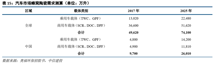 汽油车加装GPF,柴油车转为DOC+DPF+沸石SCR+ASC,国六标准下单车蜂窝陶瓷用量翻倍。据我们测算,全球蜂窝陶瓷需求将由2017年的5.0亿升增长至2025年的7.4亿升,年均增速5%;国内蜂窝陶瓷需求将由2017年的约0.97亿升增长至2025年的约2.6亿升,年均增速13%。