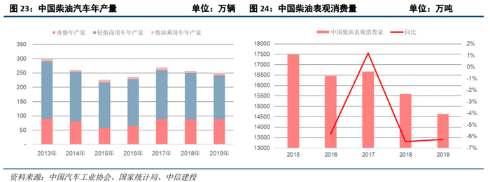 我们使用中国汽车工业协会公布的数据来测算尾气后处理市场。我们将国内汽车类型简单分为国内重型商用柴油车、轻型柴油车(轻型商用柴油车、乘用柴油车)及乘用汽油车三类。2019年,我国重型商用柴油车、轻型柴油车及乘用汽油车分别生产88、162、1996万辆,同比增长0.82%、-4.17%、-9.88%,乘用汽油车占比将近90%。