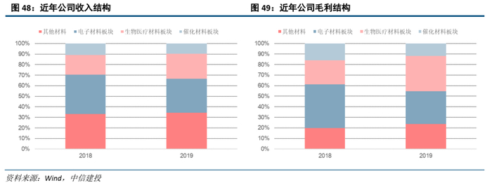 产品技术储备完善。在汽车后处理领域,2019年公司完成了符合国六排放标准的催化剂配方的全系开发(DOC、DPF、SCR、ASC、TWC),具备了国六标准柴油机尾气后处理系统(DOC+DPF+SCR+ASC)供货能力和汽油机尾气后处理(TWC+GPF)供货能力,并在2019年分别实现了小批量和规模化供货。