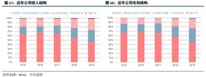 柴油发动机尾气处理液业务比重逐步提高。2019年柴油发动机尾气处理液贡献公司约27%的营收合约32%毛利;公司第一大业务为润滑油,2019年贡献公司约45%的营收合约44%毛利。