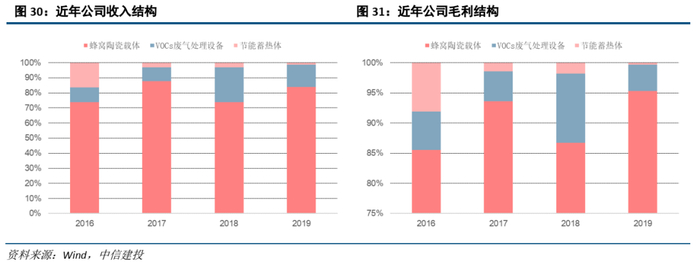 蜂窝陶瓷载体贡献主要营收和毛利。2019年蜂窝陶瓷载体贡献公司约84%的营收合约95%毛利;VOCs废气处理设备业务占比略有下降,2019年约贡献公司约15%的营收和4%的毛利;节能蓄热体产品贡献逐年缩小。