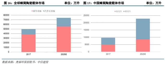 2025年我国汽车行业蜂窝陶瓷载体的总体市场需求量预计达到26,010万升,市场空间近100亿元,年均增速;全球汽车市场蜂窝陶瓷载体的市场规模将达到74,100万升,市场空间约250亿元,相对2017年均有较大幅度提升。