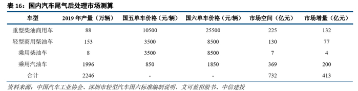结合2019年国内汽车产量,我们通过测算得出2019年国内汽车尾气后处理市场国六标准下市场空间约732亿元,可以带来增量413亿元。