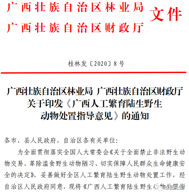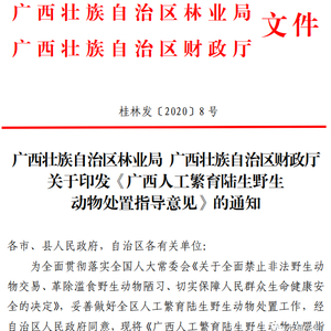 经广西壮族自治区人民政府同意,区林业局、财政厅于6月16日正式发布《广西人工繁育陆生野生动物处置指导意见》(以下简称《意见》) 。