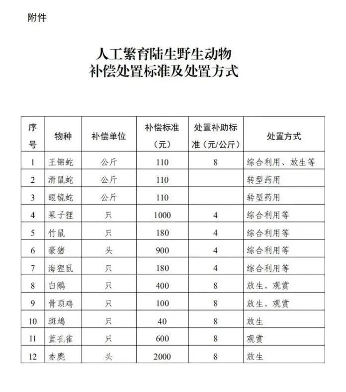 《意见》中,明确列出了人工繁育陆生野生动物补偿处置标准 。