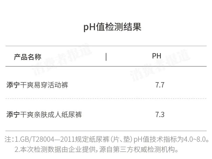 pH值用来表示酸碱度的强弱,国家标准要求成人纸尿裤(片、垫)类产品的pH值在4.0-8.0之间,若长时间接触pH值过高或过低的产品会有刺激、致敏等不良反应。测试结果显示,两款添宁纸尿裤pH值符合国家标准要求。