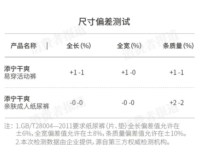 添宁的人性化产品设计也能从两款纸尿裤的尺寸偏差指标测试表现亮眼得到体现。