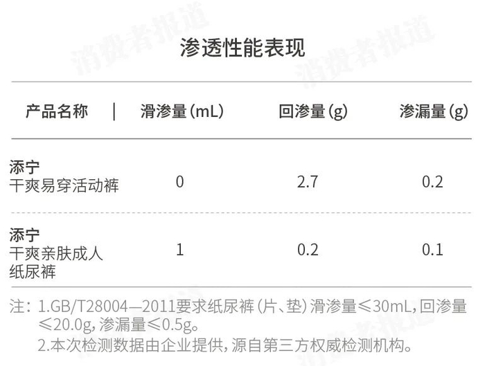 依据GB/T28004—2011《纸尿裤(片、垫)》标准,GB15979-2002《一次性使用卫生用品卫生标准》,在针对卫生安全、渗透性能、交货水分及尺寸偏差等指标对添宁上述两款纸尿裤进行的检测结果显示,无论是在产品卫生安全、渗透性能方面,还是舒适体验方面,它们都表现亮眼。