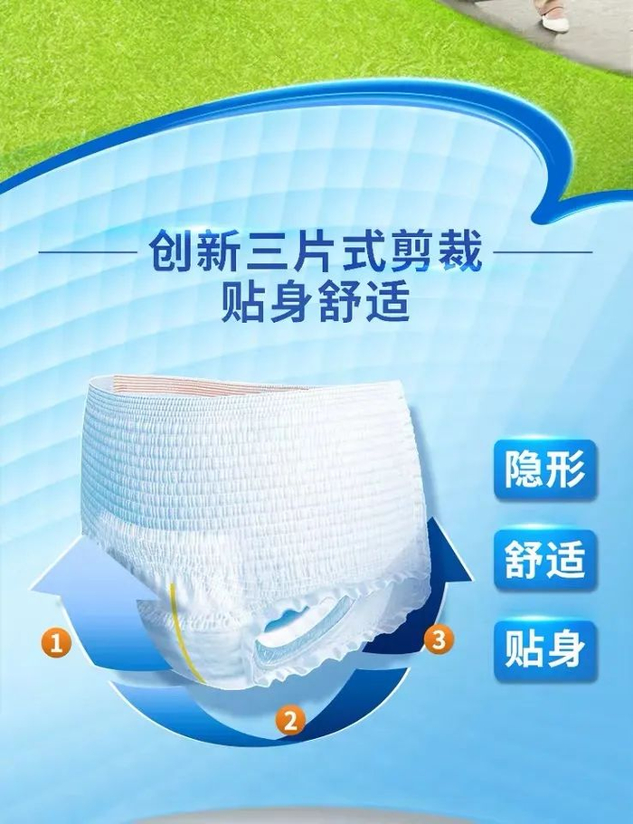 据了解,添宁干爽易穿活动裤采用了绵柔透气仿布背膜和蓝色瞬吸导流层。绵柔透气仿布背膜内含超1亿个透气微孔,能够有效减少闷热感及潮湿感。而蓝色瞬吸导流层则能够快速吸收尿液、并防止反渗,并且强力吸收体将尿液牢牢锁住,中和异味,也能够让肌肤保持干爽、不闷热。