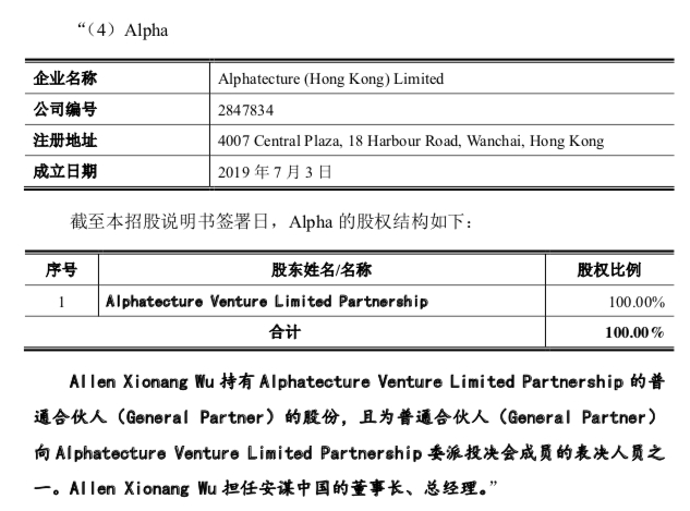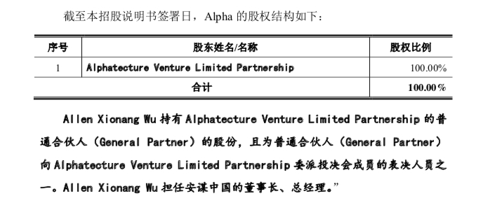 招股书信息显示,吴雄昂同时为Alphatecture基金董事。Alphatecture基金由Alphatecture Venture Limited Partnership全资持股,吴雄昂为普通合伙人(General Partner)的股份,且为普通合伙人向Alphatecture Venture Limited Partnership委派投决会成员的表决人员之一。