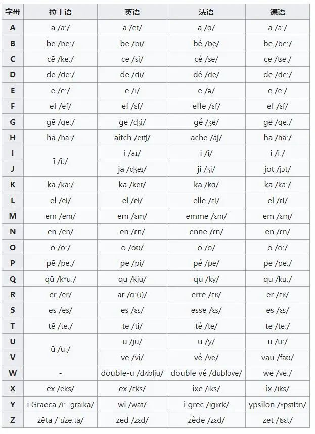 常见语言中字母发音表