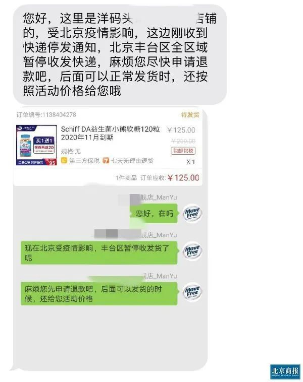 “6·18”期间,一位在洋码头购买益生菌小熊糖的消费者收到了商家的短信。商家称,受疫情影响,北京丰台区全区域暂停收发快递,希望对方能尽快申请退款,后面正常发货时,依然按照活动价结算。