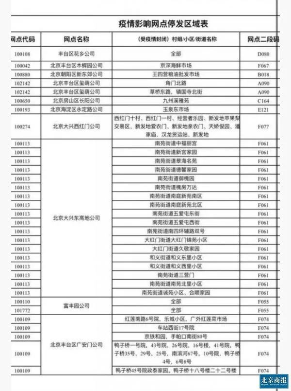 社交平台上,一些快递企业流出的暂停部分区域服务的截图被转发。在一组名为“疫情影响网点停发区域表”中,记者浏览发现,涉及区域集中在大兴区和丰台区,新发地、京深海鲜市场、花乡地区、南苑街道等区域有所涉及。此外,部分小区例如丰台区大红门街道久敬家园、和义街道合义东里小区等也列入了这一区域。