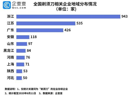 截至6月11日,企查查数据显示,从产业分布来看,剃须刀相关企业主要聚集在轻工业发达的华东、华南地区,华东占比最重达60.5%;其中浙江省拥有的相关企业最多,达943家;江苏省和广东省的相关企业数量分别以535家和426家,排名第二、第三。