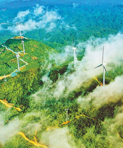 在海拔1200多米的江西省赣州市安远县九龙山风力发电场,风力发电机在云雾中随风转动。安远县两个风电场共有45台风力发电机组,年发电量1.65亿千瓦时。近年来,该县推进高山风能、水力发电、光伏发电等绿色经济发展,实现生态环保与经济可持续发展相得益彰。