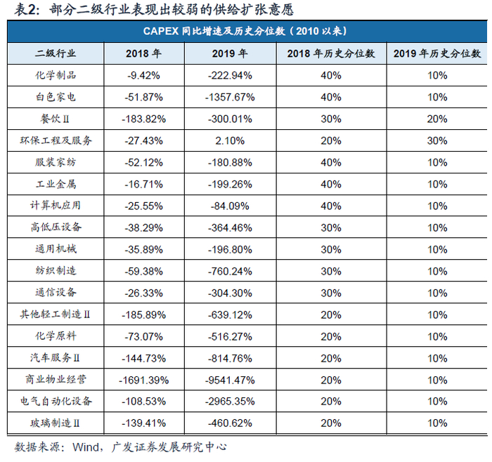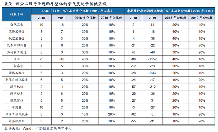 供给端往往滞后于需求端的变化,市场化供给出清通常是一个相对缓慢的过程。前期已经进入产能扩张意愿薄弱阶段的行业受疫情对需求的冲击将加速这一进程,从而在疫情后形成更为清晰的产业格局。在经历了16年以来的实体供给侧改革和18年的去杠杆之后,多数行业产能过剩的情况都得到改善,伴随着宏观整体需求大周期的回落,多数行业的扩张意愿并不强烈。在104个申万二级行业中,18年、19年连续两年资本开支增速为正的行业仅化纤、高速和采掘服务三个,其中仅化纤和高速两年的资本开支增速均处于10年以来的50%以上分位数。多数行业在过去两年并没有呈现出明显的扩张迹象。而玻璃、电气自动化设备、化学原料、纺织制造、白色家电等则在过去两年处于资本开支增速的低位且均为负,呈现出较弱的扩张意愿。我们从ROE TTM和归母净利增速的两个角度来衡量行业的景气情况,发现过去两年景气处于偏低区域的行业主要有服装家纺、汽车整车、通用机械、电气自动化设备、白色家电等,与资本开支意愿低的行业基本吻合。