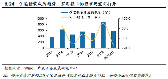 家用轻工:伴随着住宅精装修开发商的不断增加,家用轻工与地产商合作切入to B渠道的市场空间打开。由于工程端业务准入门槛高,地产商对供货能力、品牌价值和性价比均提出了更高要求,龙头的市占率在此过程中有望提升。而疫情则加速了中小厂商出清,优化竞争格局。疫情期间,线下客流受到较大冲击,头部企业拥有更强大的线上营销能力,并且蓄客量更大。同时定制行业服务流程较长,在线下服务受阻的情况下,头部企业尝试将部分服务环节线上化,加速服务推进。线上能力的相对匮乏使得中小品牌经销商或加速退出市场,龙头品牌抢占随后伴随着竣工链条和出口修复相应而来的市场份额。