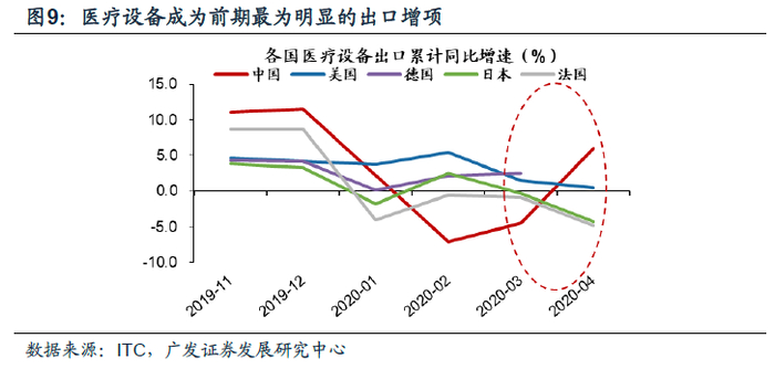 从1月-4月的全球出口数据来看,中国的医疗设备出口成为最明显的增项,在美国、法国、日本等主要出口优势国的增速回落之际(德国4月数据暂未知),中国成为了全球医疗设备的重要供给力量。但该增量一是由于海外疫情升温导致的需求激增,二是由于海外在Q2开始实施更为严格的防疫措施影响供给所致。该替代是否可持续仍有待观察。