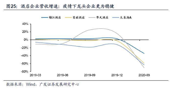 酒店:今年春节前爆发的新冠疫情引发了酒店业的断崖式下跌,行业经营整体承压,一季度酒店企业营收同比增速普遍为负。但相对来看,冲击之下龙头企业更为稳健。前期经营困难和现金流冲击一方面出清部分小型酒店,疫情激发用户卫生意识也有助于大品牌更受青睐。预计伴随着需求逐步复苏,龙头企业的表现也将更具弹性。预计疫情结束后龙头企业将率先迎来业绩修复,行业份额将持续向头部集中。