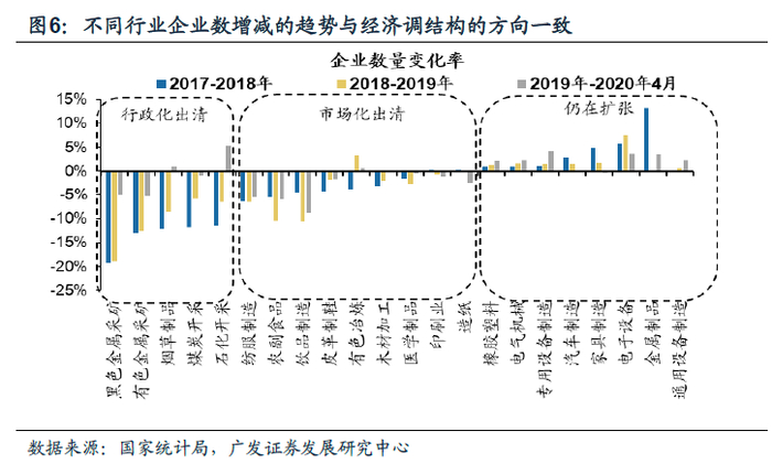 通常在扩张期,企业数量增加;出清期企业数量减少,伴随着行业集中度的提升,则会呈现个别龙头规模扩张,但行业内企业数量减少的现象。从18年、19年和20年4月分别对比上一年的企业家数的变化情况来看,周期上游资源类的企业家数仍在继续减少、中游轻工制造的企业也在有序退出,而中游设备制造和高端制造的企业则在增加。企业家数的整体变化情况也与经济调结构的方向基本一致。