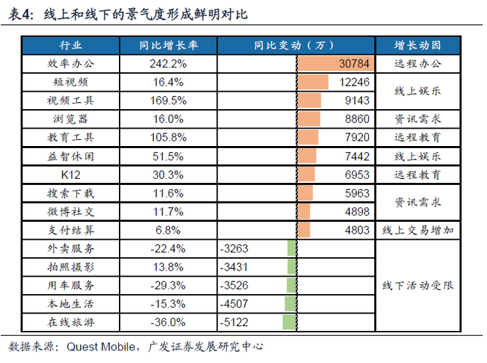 景气分化较为明显的如传媒行业,20Q1归母净利增速Top3的互联网、游戏和教育均偏线上业,线上教育、视频的爆发和线下教育、影院的重创形成鲜明对比。从财报数据来看,短期性远程复工、大中小学授课线上化使得移动办公、教育工具、K12等板块成为不同年龄段用户的刚需,板块用户规模于2020年3月分别获得同比242.2%、105.8%及30.3%增长。疫情限制线下出行,社交娱乐大面积转移至线上,视频工具、短视频、益智休闲游戏等极大受益,同比增长分别达169.5%、16.4%及51.5%,相应替代在线旅游、用车服务、拍照摄影等需求,使此类与线下活动相关性较大的板块普遍呈现负增长,其中,在线旅游受损尤为严重,3月用户规模同比同比减少5122万人(-36.0% YoY)。