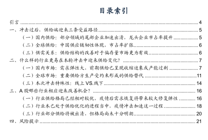 ●冲击过后,供给端逻辑的受益路径:(1)国内供给端,部分行业的尾部企业加速出清,龙头企业市占率提升,利润率抬升。(2)全球供给端,海外部分产线加速退出,中国企业迎来替代良机。(3)全球供给端,海外部分供给阶段性受疫情约束,中国企业加速抢占市场。